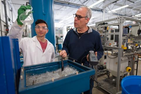 Graduate student Louis Miyasaki and Professor Tzahi Cath work with the electrocoagulation pilot system in the Center for a Sustainable WE2ST at Mines.