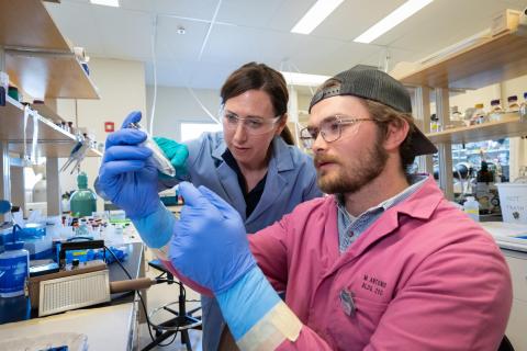Jenifer Shafer, professor of chemistry and Ben L. Fryrear Presidential Chair, works in the Radiochemistry Lab with Nuclear Engineering PhD student Klemmer Nicodemus.
