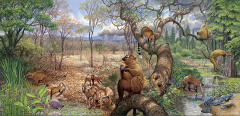 Image credit: A detail from “The Trek through Time,” a 16-plaque diorama at the U.S. Geological Survey’s headquarters in Reston, Virginia. Painted by Aldo Chiappe and courtesy of National Geographic, the scene depicts the Paleocene Epoch, 66 to 56 million years ago.