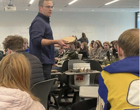 Jason Puffett, the division chief of wildland for Evergreen Fire Rescue, shows Mines students the types of forest waste materials for which they’re trying to find long-term solutions.