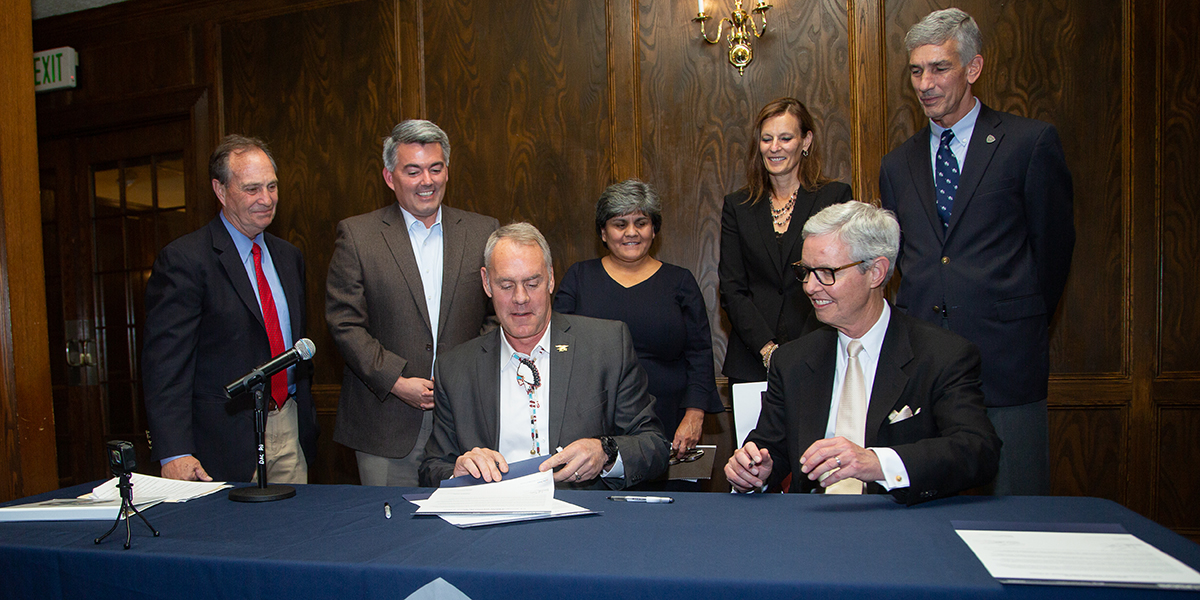 Today, U.S. Secretary of the Interior Ryan Zinke joined Paul C. Johnson, president of Colorado School of Mines, to announce a long-term partnership between the university and the U.S. Geological Survey (USGS). The partnership will bring more than 150 USGS scientists and their minerals research labs to the university’s Golden, Colorado campus where government scientists and Mines faculty and students will work together in a new state-of-the-art facility. Johnson and Zinke were joined at today’s announcement by Senator Cory Gardner and Congressman Ed Perlmutter, as well as Mines Board of Trustees Chairman Thomas E. Jorden and Roseann Gonzales-Shreiner, USGS Associate Director for Administration and Acting Director for Southwest Region.