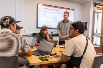 Students discuss a mini design challenge with Adjunct Professor Garrett Erickson during their first day of Design I in McNeil Hall.