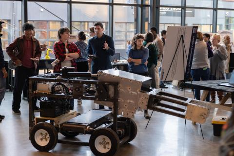 Adam Solovay, master's degree student in space resources, shows off his moon trencher during the ProtoFund Showcase conducted at the Labriola Innovation Hub on December 8, 2025.